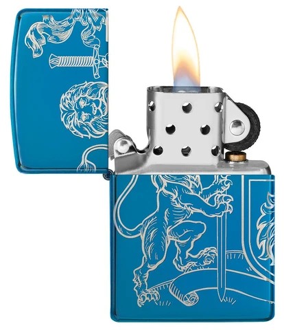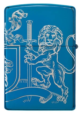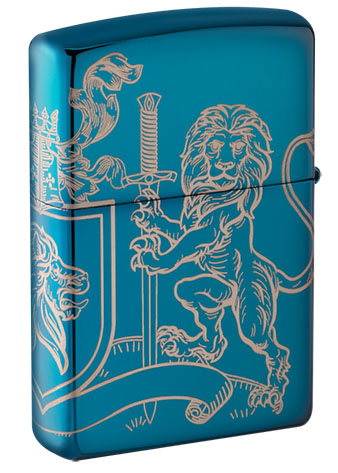 No symbols bring forth images of Knights in shining armor or ancient castles as much as the ones on this Medieval Coat of Arms lighter. A shield with lions, swords, and banners appear all around this High Polish Blue lighter. The Laser 360° process brings this medieval imagery to life. Comes packaged in a gift box. For optimal performance, fill with Zippo lighter fuel.
