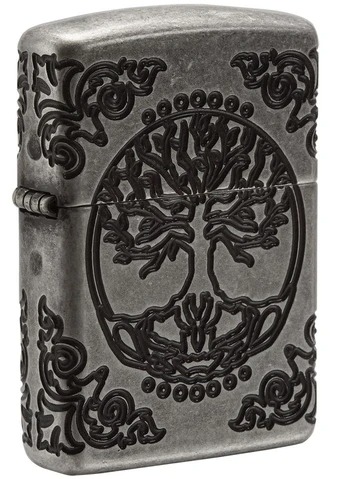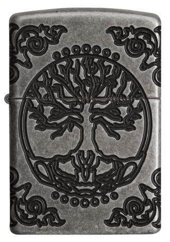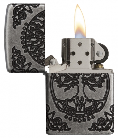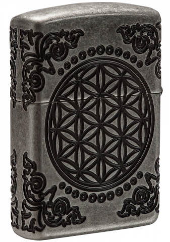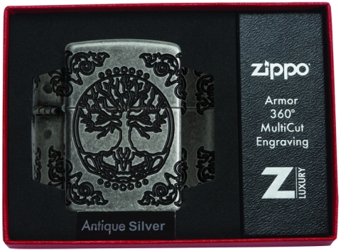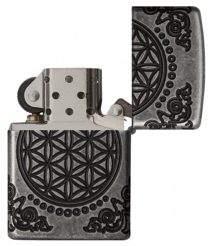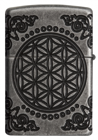 This harmonious MultiCut design set on an Armor® Antique Silver finish lighter features the Tree of Life, connecting every living thing, past, present, and future to the Earth. The Flower of Life, one of the earliest examples of sacred geometry, represents the eternal link between space and time is shown on the back of this lighter. Luxury packaging reveals how the Art Nouveau-inspired corner elements wrap onto the sides of the lighter allowing for greater viewing of this lighters details. For optimal performance, fill with Zippo lighter fuel.