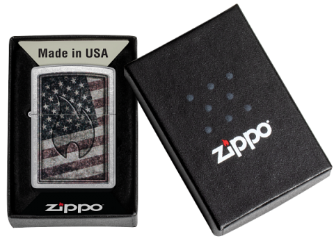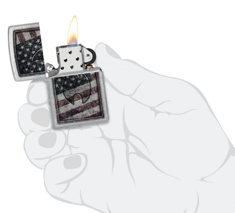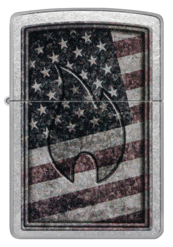 Old Glory appears behind the classic Zippo flame icon on this Street Chrome™ lighter. The Color Image design appears well-worn at first glance with its patina effect. Comes packaged in a gift box. For optimal performance fill with Zippo lighter fuel.