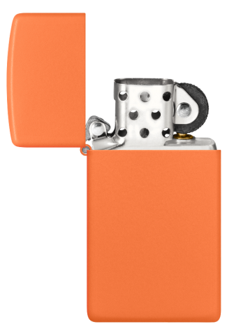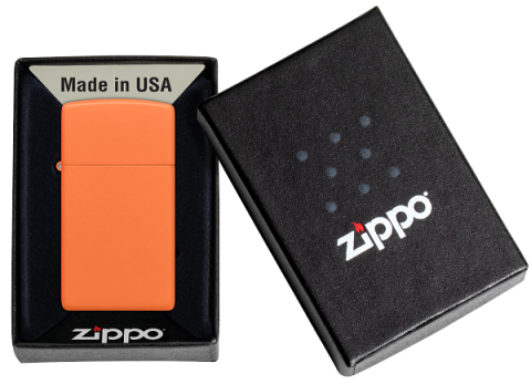 A smaller version of our classic windproof lighter. This Slim® orange matte lighter is easy to fit right in your pocket, bag, or purse. This lighter is also available in a Classic case. Comes packaged in a gift box. For optimal performance fill with Zippo lighter fuel.