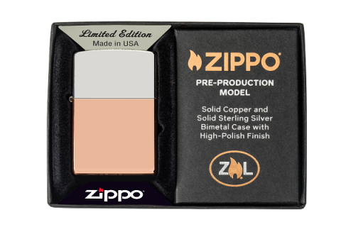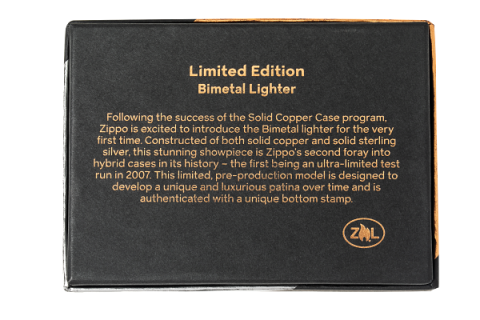 Following the success of the Solid Copper Case program, Zippo is excited to introduce the Bimetal Case lighter for the very first time. Constructed of both solid copper and solid sterling silver and buffed to a high-polish finish, this stunning showpiece marks Zippo’s second foray into hybrid cases in its history – the first being an ultra-limited test run in 2007.