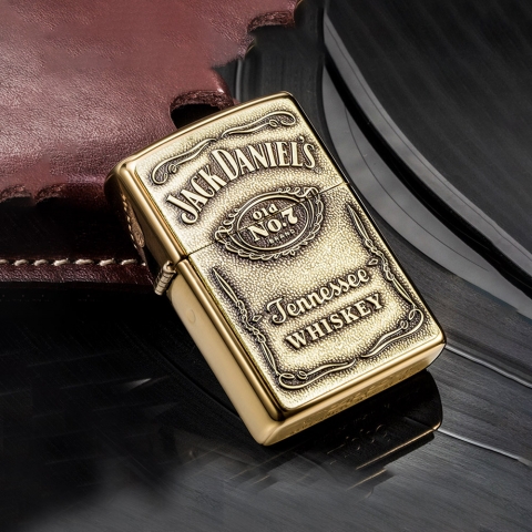 Zippo與美國威士忌品牌Jack Daniel’s聯名,在高拋光金色鏡面上使用徽章貼印技術貼上經典品牌標誌,展現出古老歷史釀酒廠的氣息與特色。