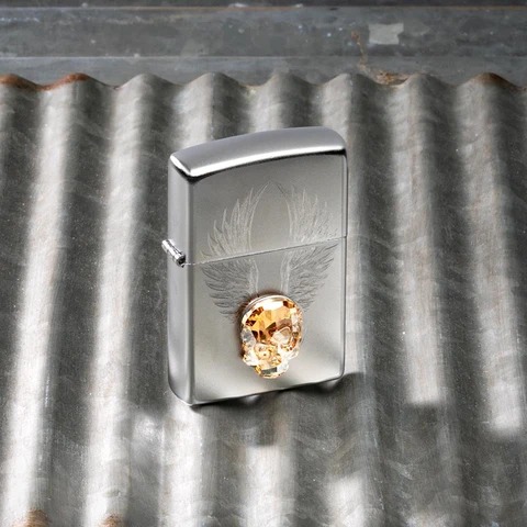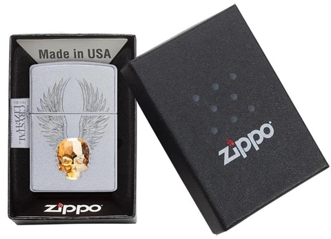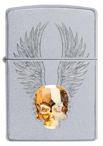 這款緞面鉻打火機採用Zippo打火機史上最大的Swarovski水晶之一。 閃閃發光的3D水晶頭骨,自動雕刻和羽毛羽翼相結合,對設計產生了壓倒性的積極反饋。