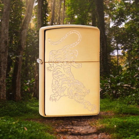 此款採用高拋光黃銅鏡面機身並透過雷刻技術,刻有復雜的老虎圖案,其反射品質為該款式增添了有趣的外觀。當在燈光下顯示時,老虎似乎漂浮在表面上方!