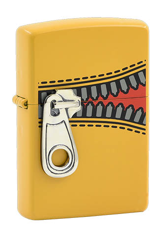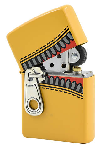 此款使用黃色啞漆表面並在上下蓋連接處透過彩噴技術,設計出拉鍊接合的圖片並加上立體拉鍊造型徽章,生動的樣子彷彿可以透過拉鍊將打火機給閉合起來。