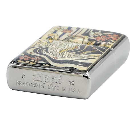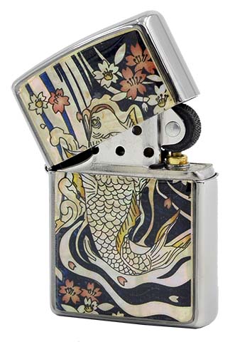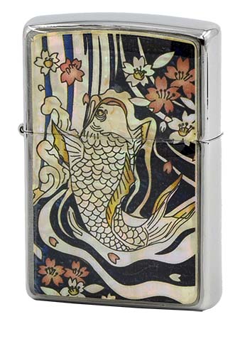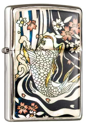 此款使用經典髮絲紋機身並在正面設計了貝殼藝術,此工藝是將具有類似貝殼七彩反光的特質搭配上日式作畫,鯉魚在河流裡躍起了許多花片。