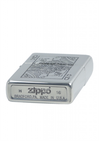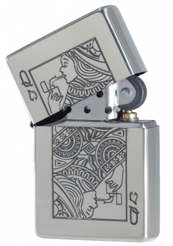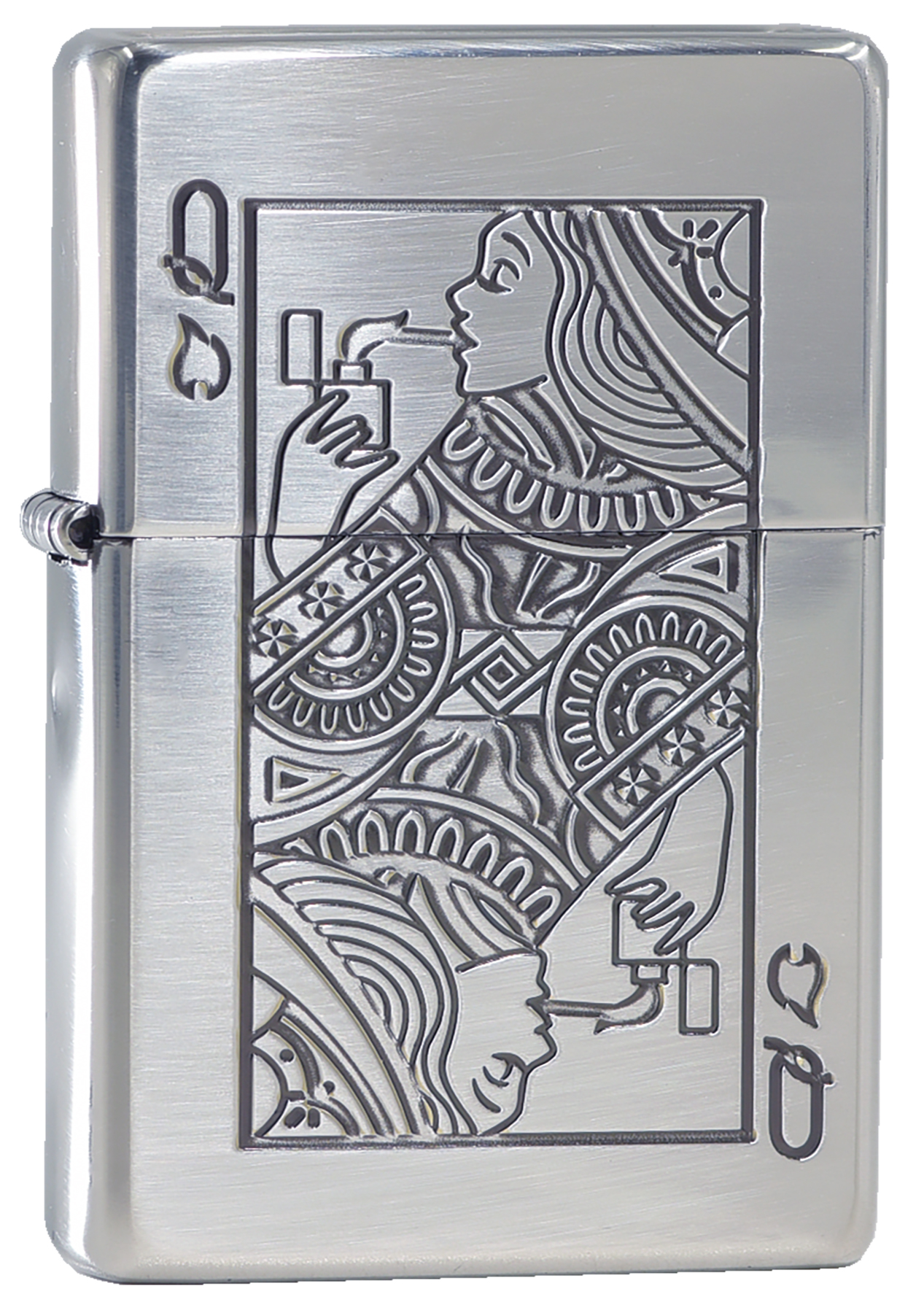 此款使用高拋光機身並透過雷雕工藝在正面出刻出王后撲克牌,並使用雙底部機身設計,在打火機的頂部及底部皆為機身辨識標誌,獨特的外觀值得您的收藏!