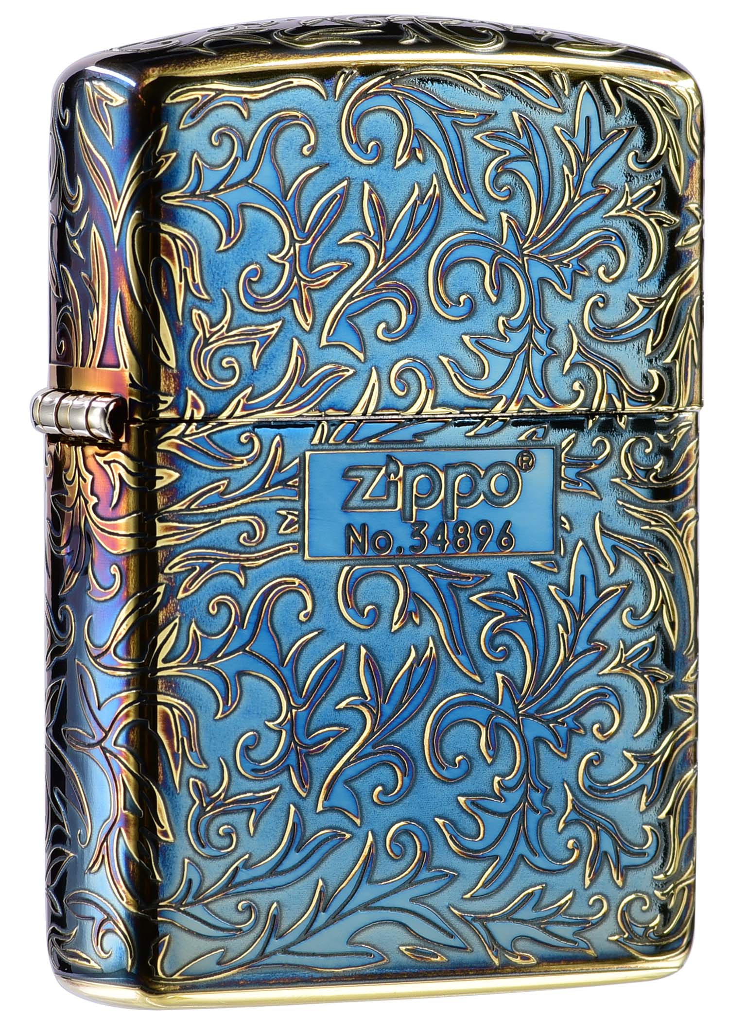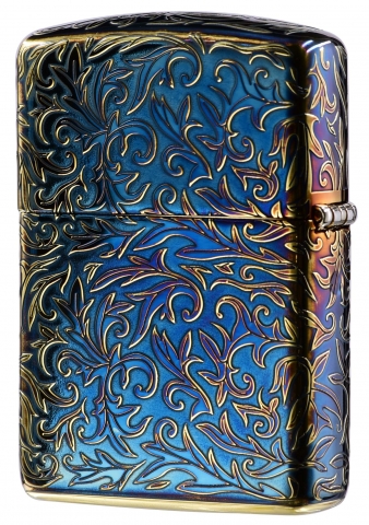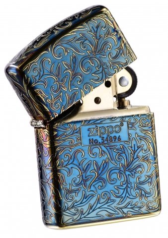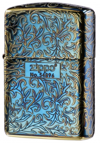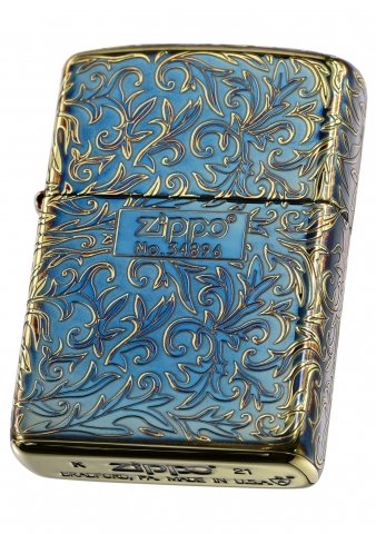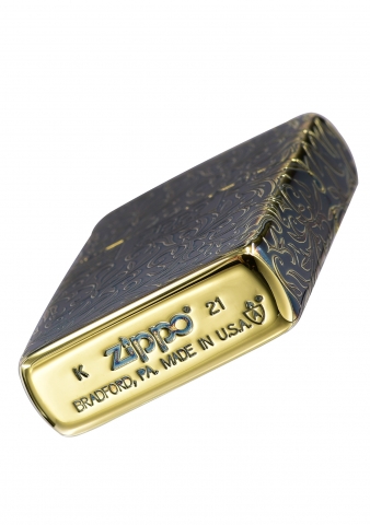 此款使用仿古金色Armor加厚版機身並經由特殊工藝處理,創造出燻黑金色的表面,透過精緻雷射雕刻、五面蝕刻技術設計,整體呈現出班藍色彩的藝術感以及富麗華貴的氣息,正面在ZIPPO標誌下方刻有生產序號,使此款每一個都是獨一無二的防風打火機。