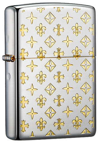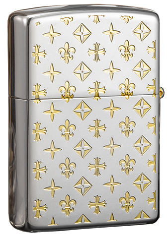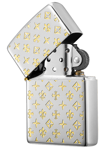 此款使用高拋光亮銀色作為機身底色,並透過雷射雕刻刻畫出多的不同的花紋圖案,用金色去點綴整體的銀色色調,創造出尊爵不凡的耀眼設計,是一款外型精美且造工細緻的防風打火機。