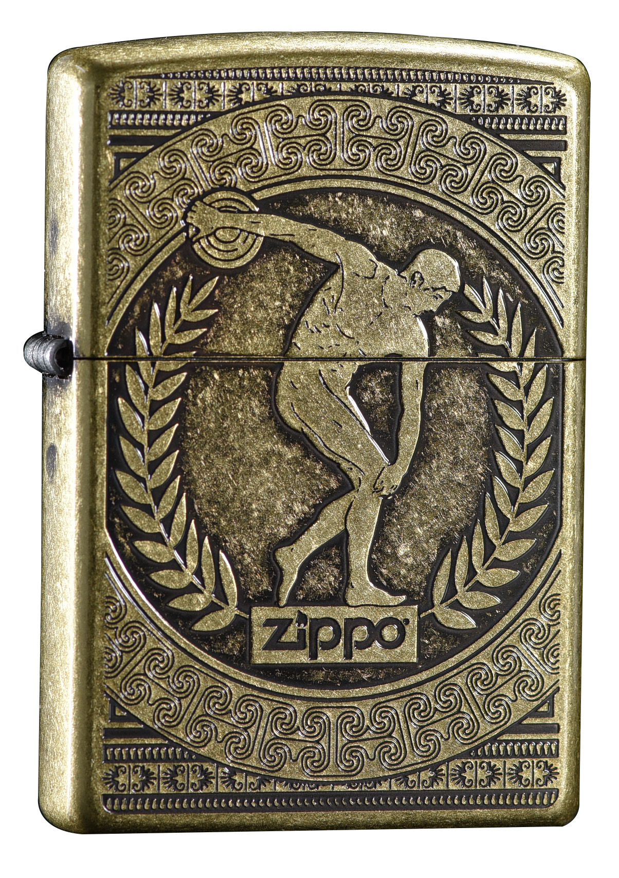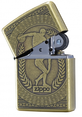 此款採用仿古黃銅機身經由雷射雕刻技術,刻劃出古典運動項目-擲鐵餅的圖案,並加上ZIPPO經典的標誌。仿古銀的懷舊紋路色澤更突顯出擲鐵餅運動項目的悠久歷史,是一款值得收藏的防風打火機。
