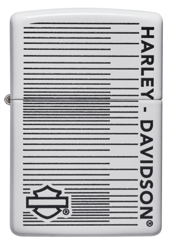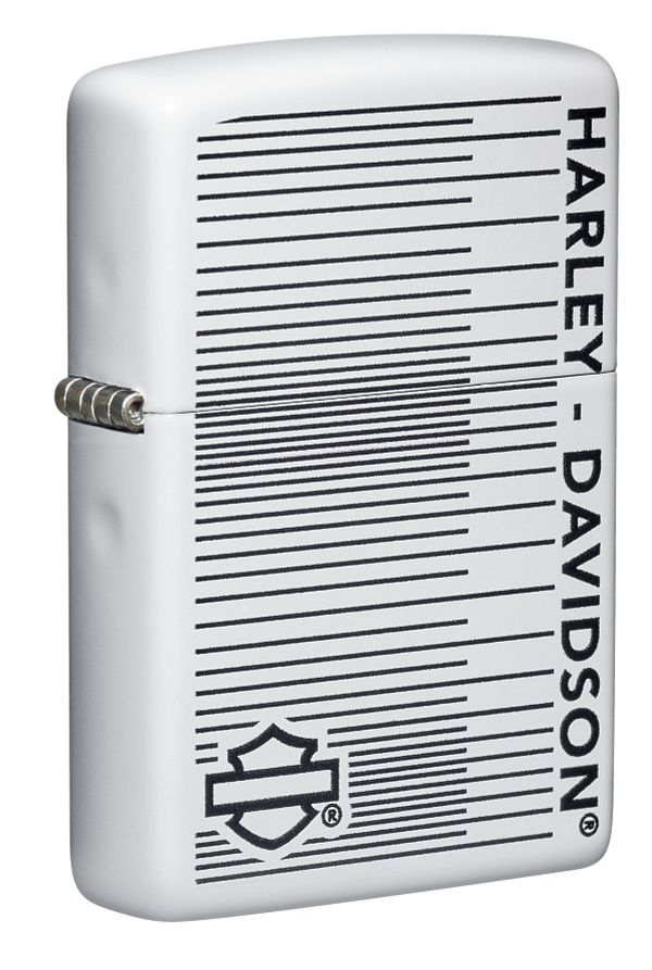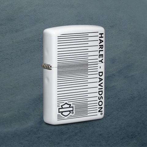 此款採用經典白色啞漆機身並透過色彩成像技術,將經典的哈雷戴維森品牌LOGO及名稱以簡約排版呈現在正面處,再透過許多不規則的橫線線條去搭配,是一款低調且好看的防風打火機。