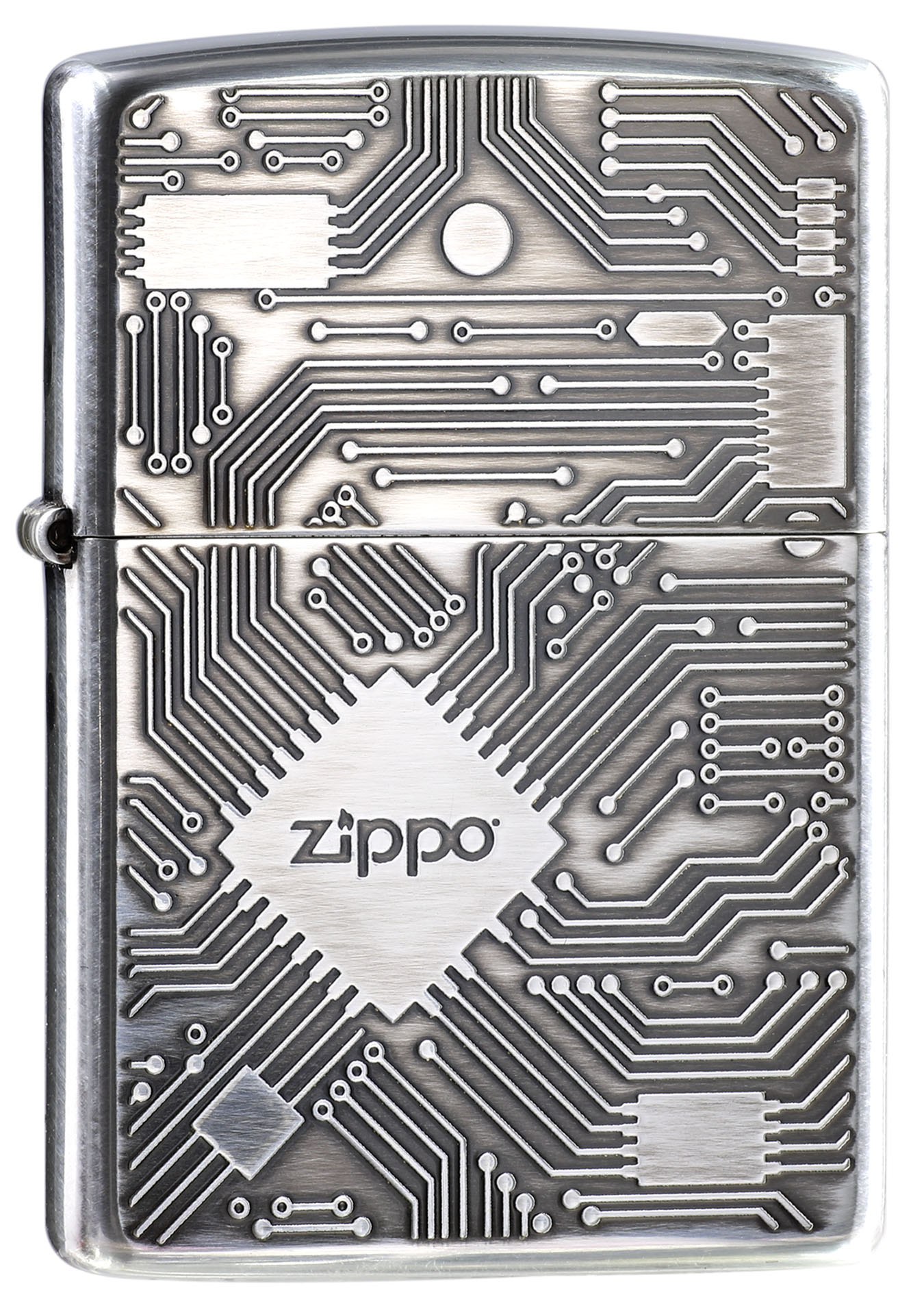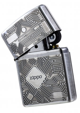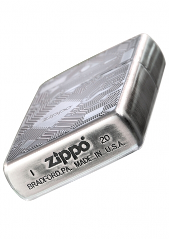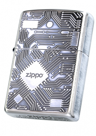 此款使用霧化處理的拉絲銀色亮面機身,並在正面處透過精緻雷射雕刻,刻畫出具有立體感的電路板,藉由顏色的深淺更突顯出電路板的特色。經典的ZIPPO標誌設計在晶片的位置,象徵著ZIPPO驅動了這個打火機。