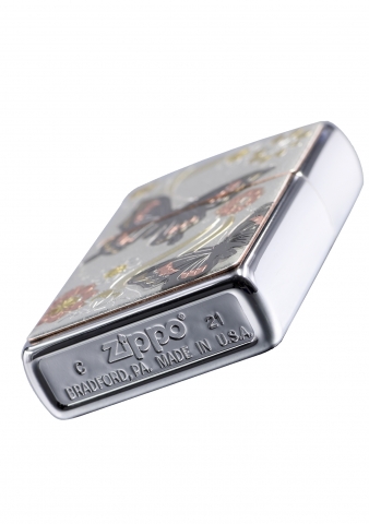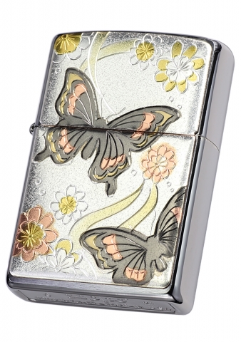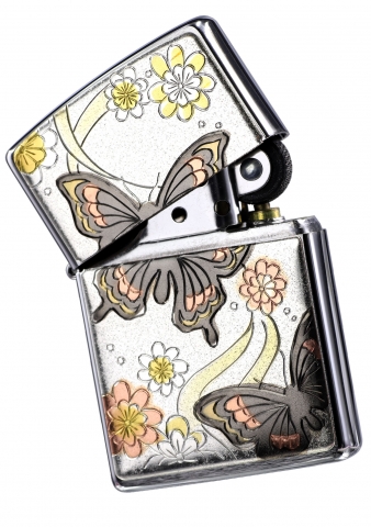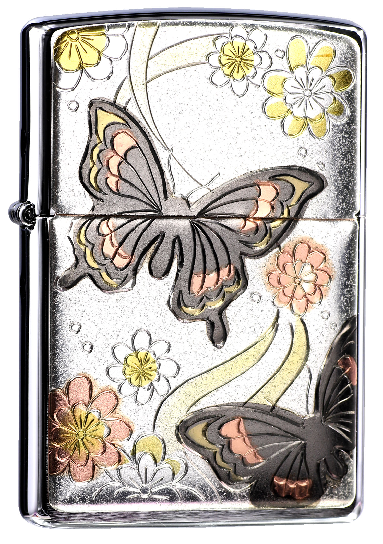 此款採用經典髮絲紋機身並在正面使用貼印技術,描繪絢麗的蝴蝶在花海中翩翩起舞的意象呈現出來,象徵著生命力與美麗氛圍的展現,細緻的雕刻與艷麗不誇張的色調使此款打火機更具質感。