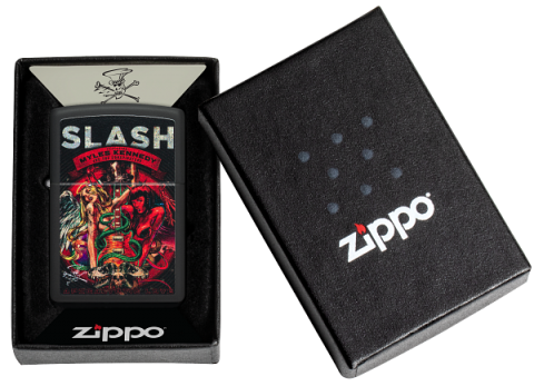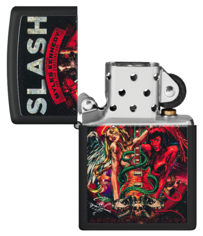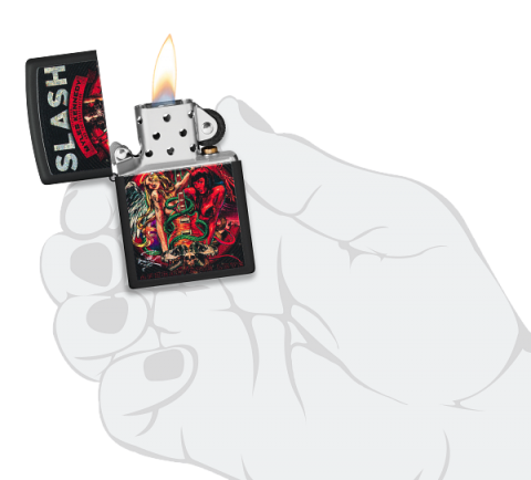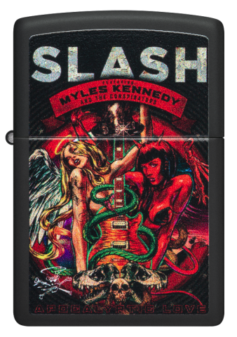 此款採用黑啞漆機身,正面透過色彩成像技術將著名樂隊SLASH於2012年發行的《Apocalyptic Love》專輯封面呈現出來。是喜愛SLASH樂隊的你不容錯過的一款防風打火機。