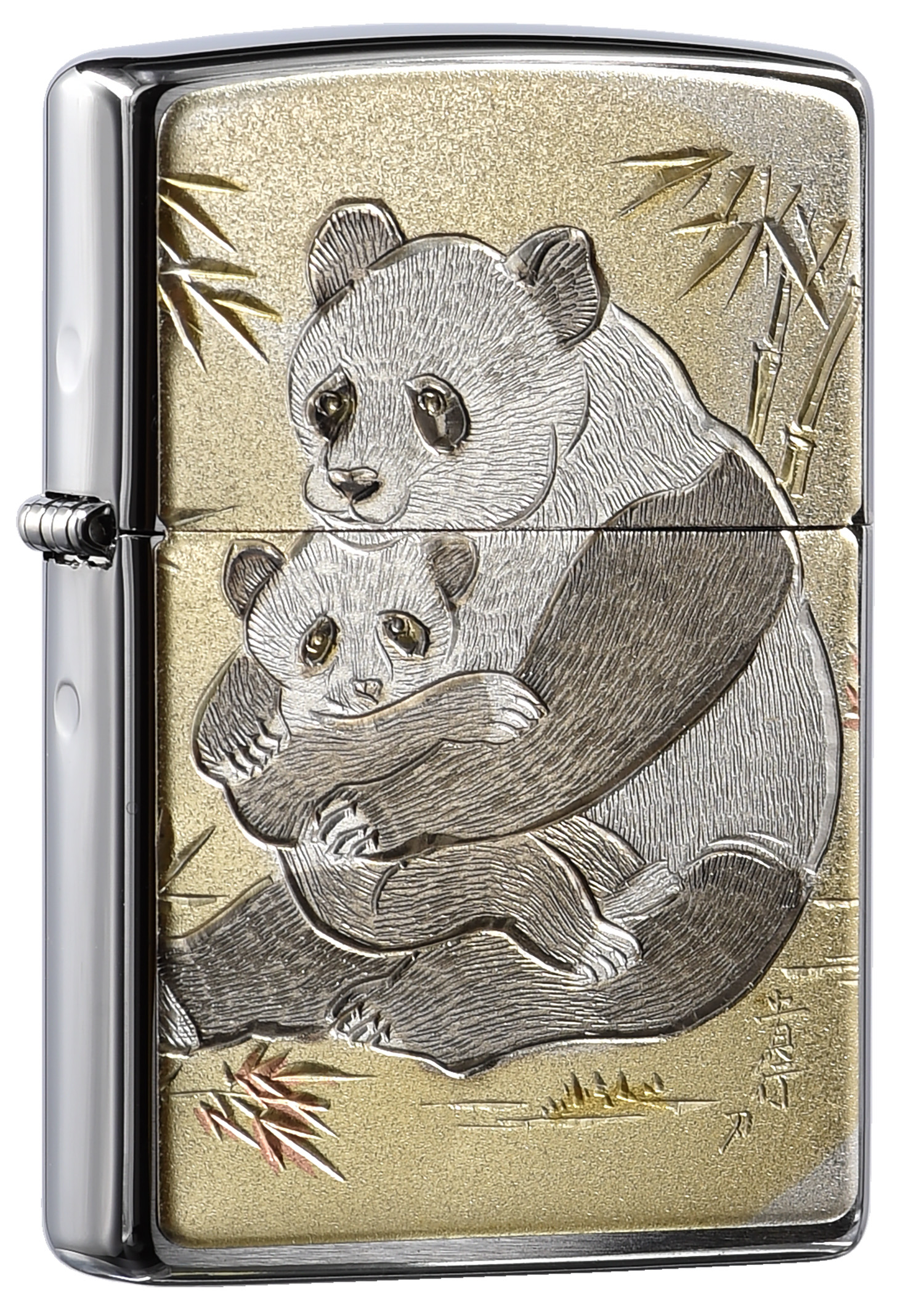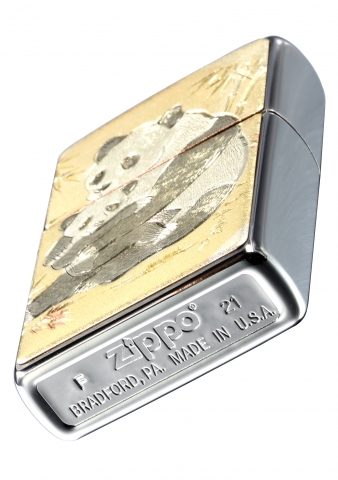 此款採用經典髮絲紋機身並透過雷雕彩噴技術,將大小熊貓刻畫於正面,並細緻地刻劃出兩隻熊貓毛髮的紋路。