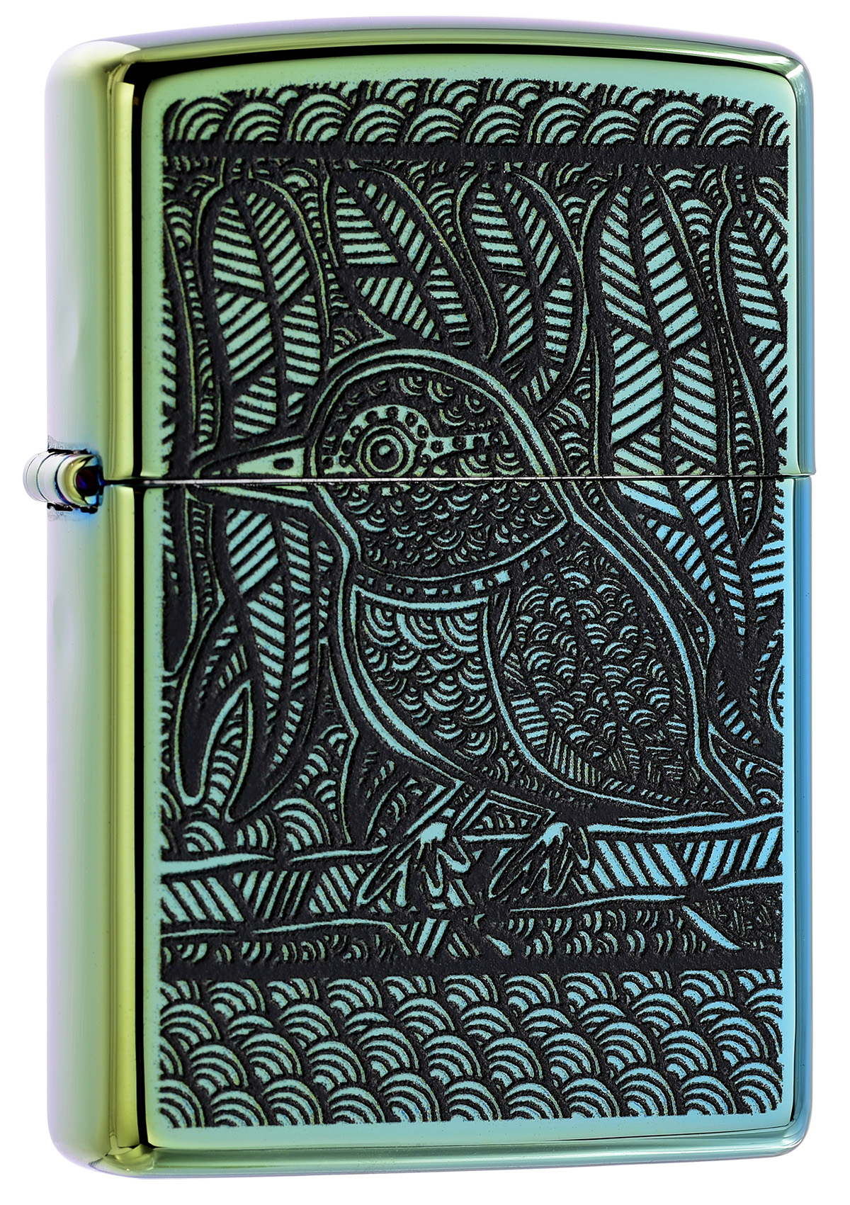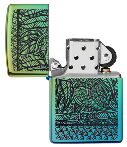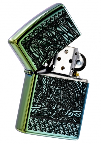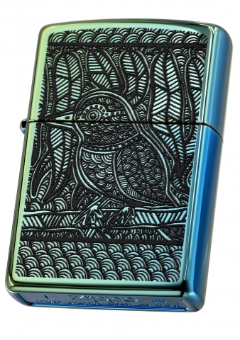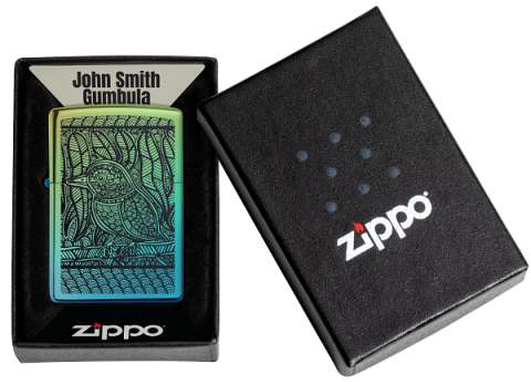 這款打火機是Zippo與澳大利亞原住民文化大使John Smith Gumbula聯合推出,在藍綠冰的機上正面,使用色彩成像技術噴印上了John Smith Gumbula的藝術作品。