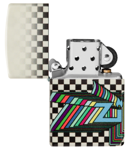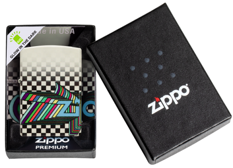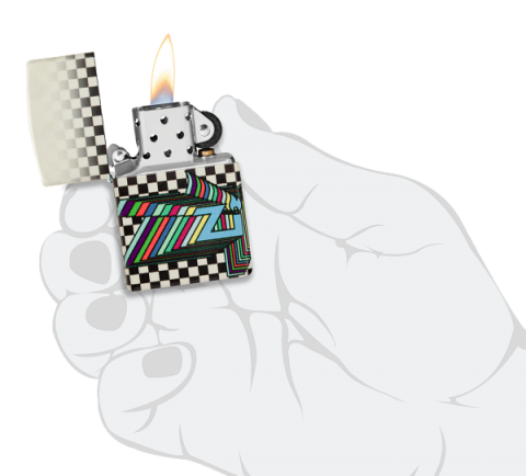 此款使用螢光漆機身並透過色彩成像技術,設計了黑白格子的底圖與從側面像兩側延伸的Zippo彩色LOGO。同時機身具有夜光效果,在黑暗中能呈現另一種氛圍。