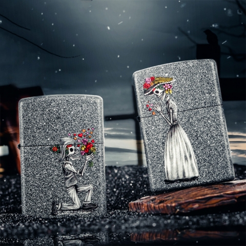 死亡無法阻止真愛。 這對情侶對機採用磨砂表面並設計一對浪漫的求婚骷髏情侶,創意的圖案象徵至死不渝的愛。 品名:骷髏之戀 型號:28987 材質:黃銅 規格:火機高度:57mm(±5%) 火機寬度:38mm(±5%) 火機厚度:13mm(±5%) 火機重量:81.65g(±5%) 產地:美國 ‧正品Zippo防風打火機,皆帶有獨特的Zippo“click”聲音 ‧防風設計幾乎適用於任何地方,材質堅固耐摔且保證能連續使用73000次以上 ‧美國製造,享有終身保修服務;為獲得最佳性能,建議使用Zippo原廠專用油、打火石及棉蕊 ‧Zippo打火機新品皆未含燃油,須另購原廠專用油 #萬聖節