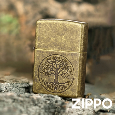 這是Zippo的生命之樹。這一棵生命樹通過了Lustre的工藝裝飾這款Antique Brass打火機,它的根部是一個小型的Zippo火焰。