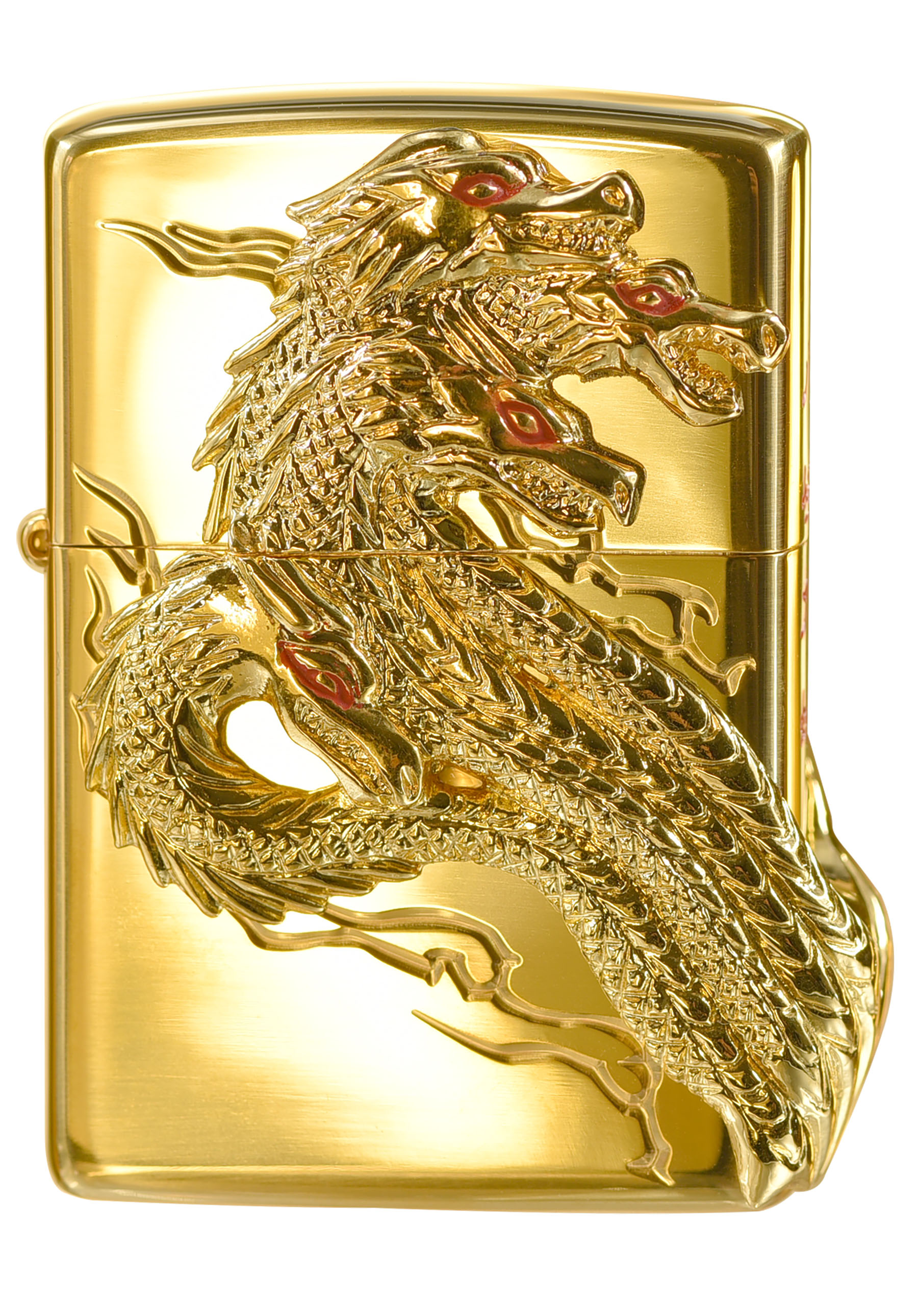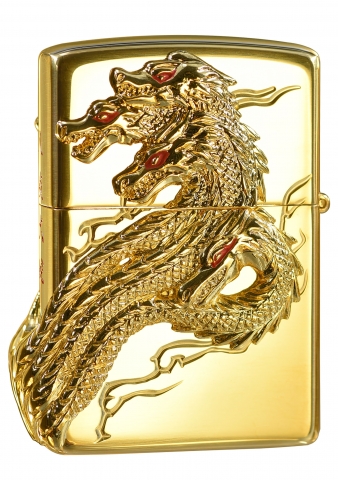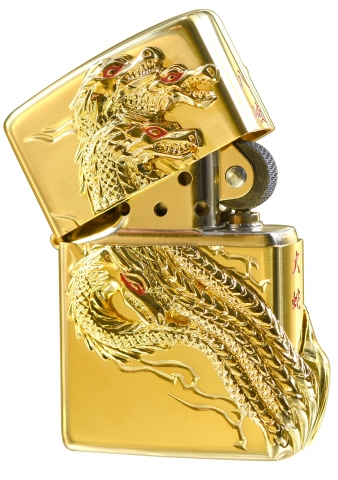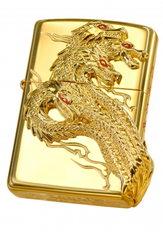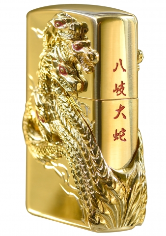 此款採用高拋光金色黃銅鏡面並透過特殊貼印技術,將氣勢磅礡的八岐大蛇呈現在機身的正反兩面,側面處則透過雕刻技術刻畫上鮮紅色的中文-八岐大蛇四個字,是一款值得收藏的ZIPPO防風打火機。八岐大蛇是神話中的怪物,一般被認為是某種強大的妖怪或是禍神。
