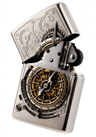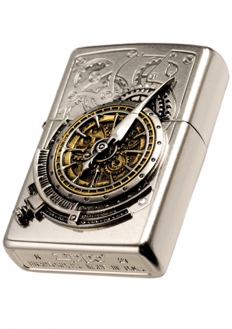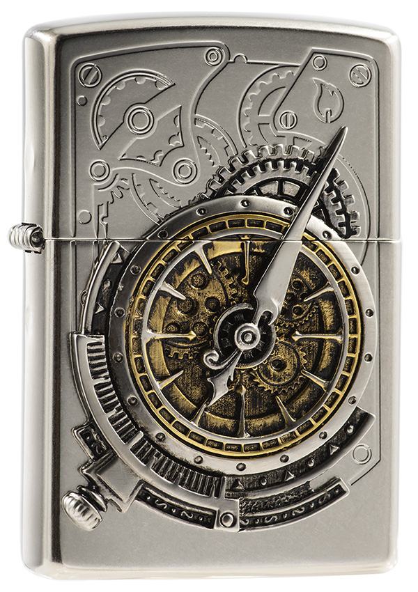 此款整個表面,包括側面和底部,皆用一種特殊的介質中滾動打磨,具有隨意的“仿舊”外觀。正面採用雕刻技術設計了一些蒸氣龐克風格的齒輪圖形,搭配上貼章技術將整個蒸氣龐克風格的齒輪懷錶呈現出來。簡單又精緻展現蒸氣龐克的獨特魅力。
