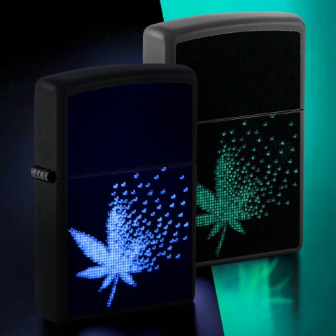 此款採用最新的黑色夜光設計,此款技術是使用一種特殊配方的墨水,將這種墨水應用於彩色圖像藝術的特定區域,使其暴露在紫外線下會產生出藍色的光芒。由綠色像素一點一點形成而成的大麻葉點陣圖,設計簡單但透過黑色夜光技術使其更加漂亮!