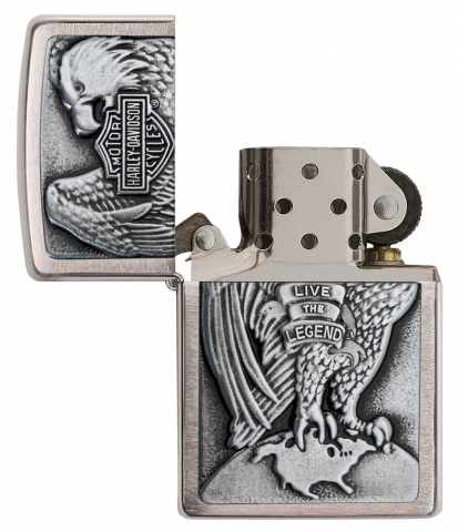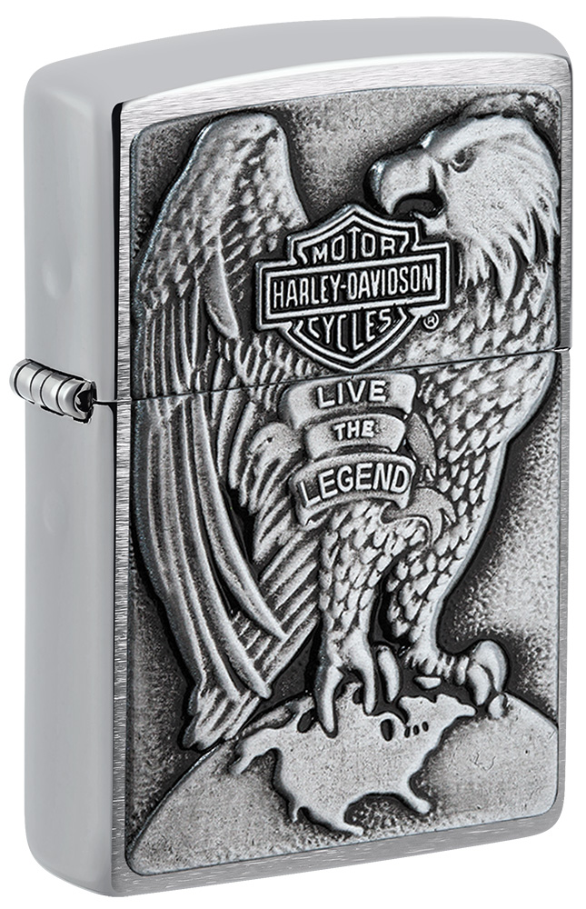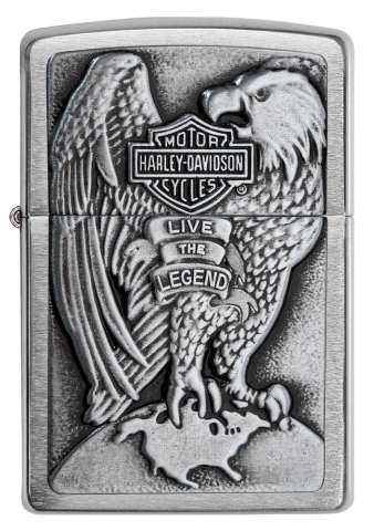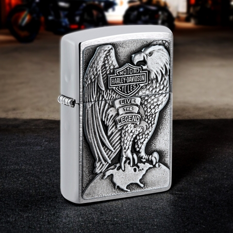 此款採用高拋光機身,透過貼章工藝在打火機正面設計了一隻眼神銳利的老鷹與哈雷戴維森的經典標誌。