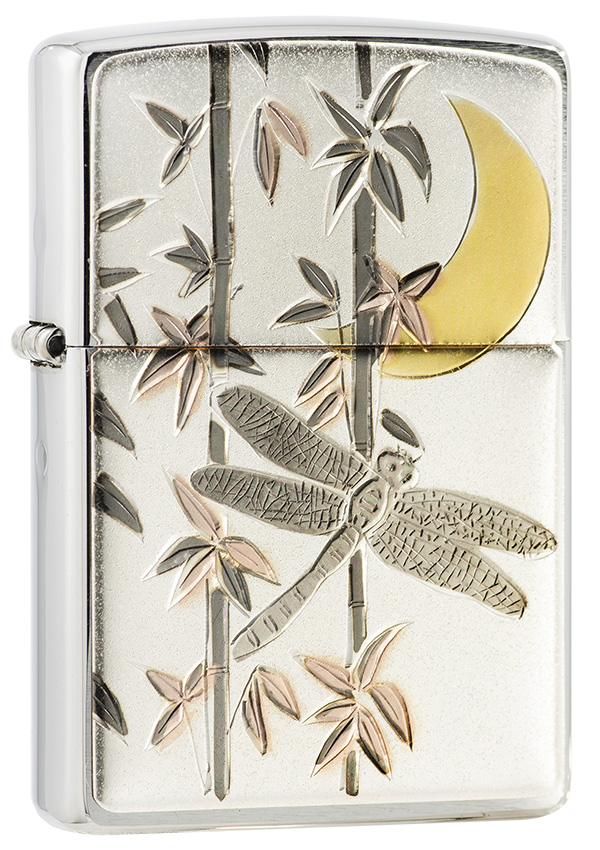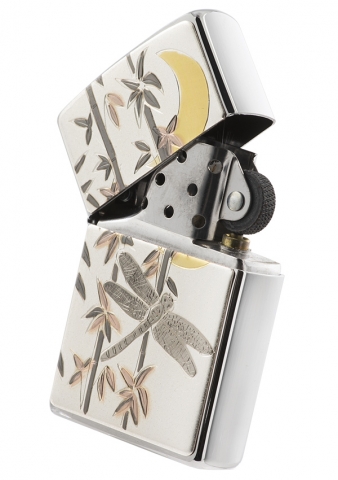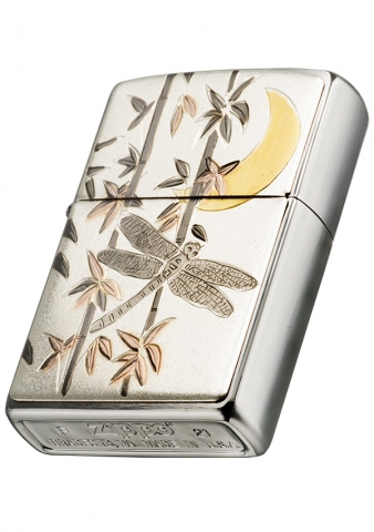 此款採用經典髮絲紋機身並在正面使用貼印技術,將一隻蜻蜓獨自飛翔穿梭在竹林裡的情景刻劃出來,細緻精美的雕刻紋路以及顏色,將日本傳統風格的美呈現出來。