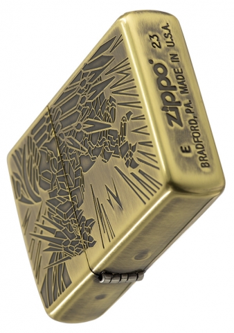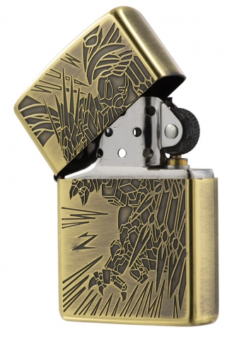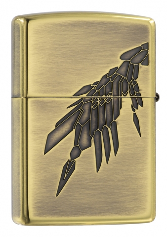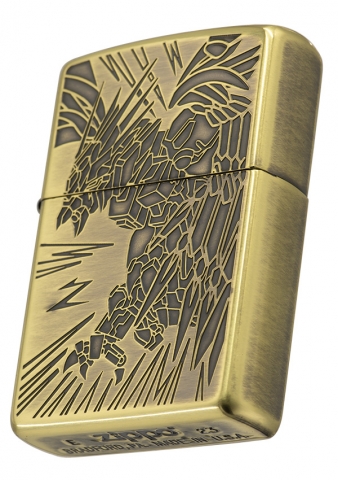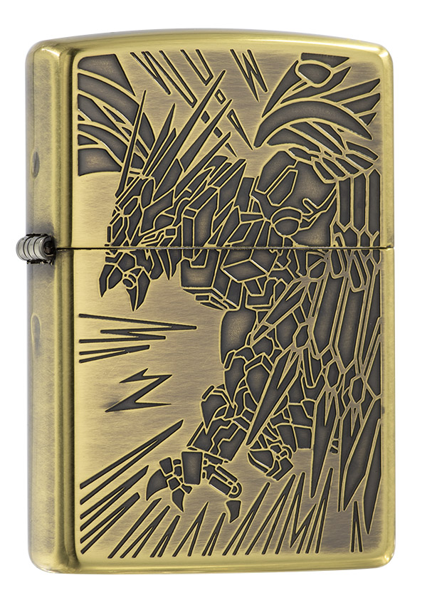 獨具品味的12生肖打火機,以亮面黃銅拉絲紋路製成外殼,正面雕刻著雞機甲型態,搭配ZIPPO獨特Z草寫小圖字,背面則呈現機械羽翼特徵。