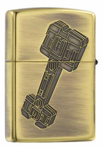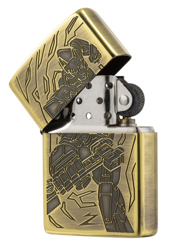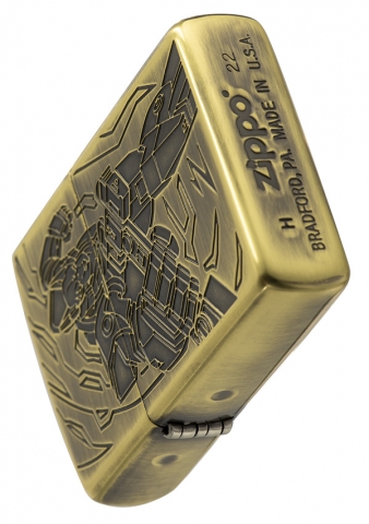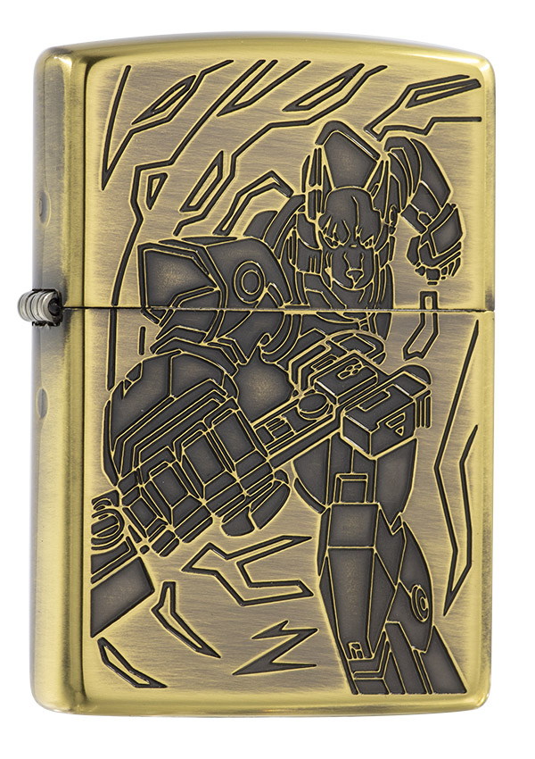 獨具品味的12生肖打火機,以亮面黃銅拉絲紋路製成外殼,正面雕刻著狗機甲型態,搭配ZIPPO獨特Z草寫小圖字,背面則呈現狗骨頭特徵。