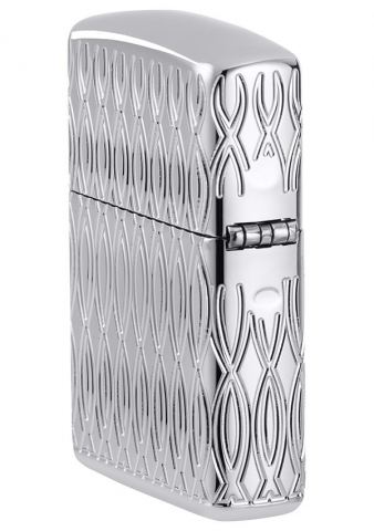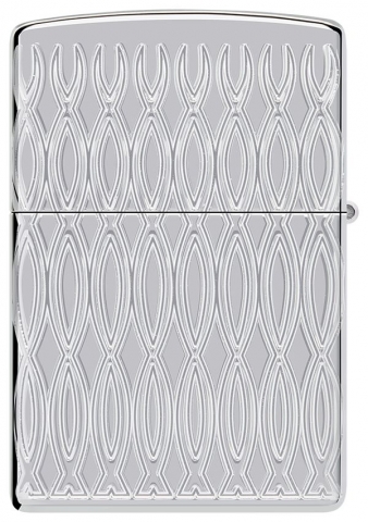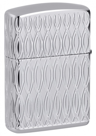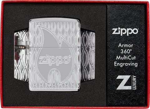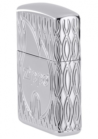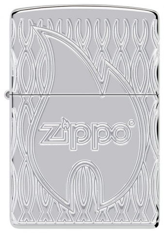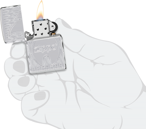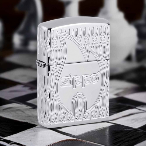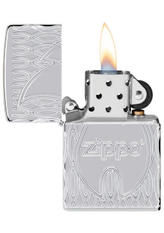 此款高拋光鍍鉻打火機的表面飾有經典的 Zippo 標誌和火焰圖標,