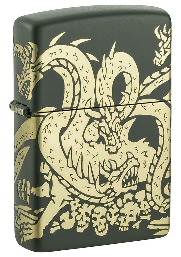 用閃亮的黃銅色調,描繪出兇猛的多頭龍屹立在其挑戰者的殘骸之上。