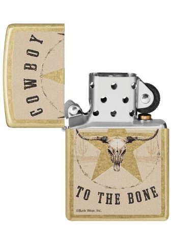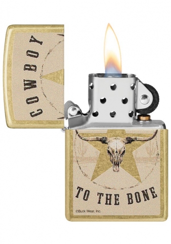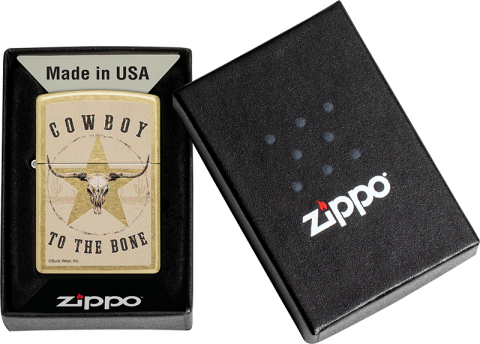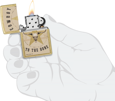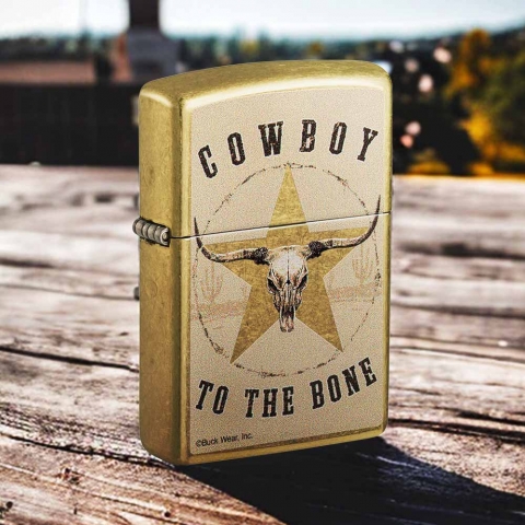 在逼真的長角牛頭骨周圍寫著“Cowboy to the Bone”。
