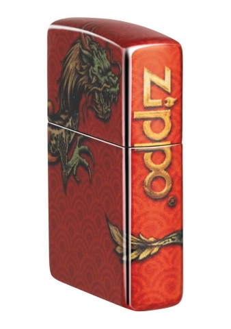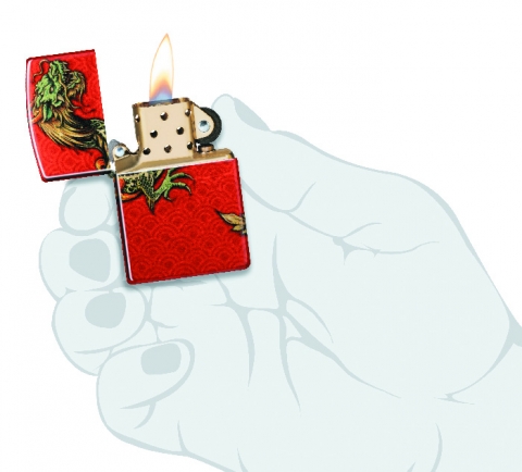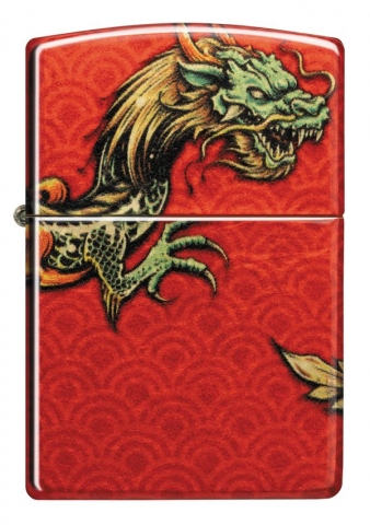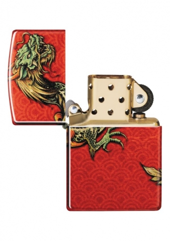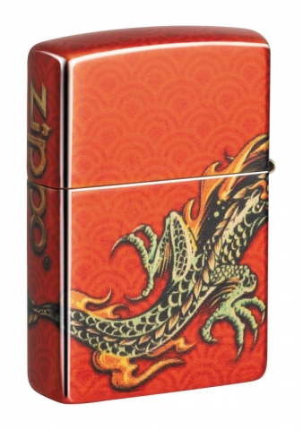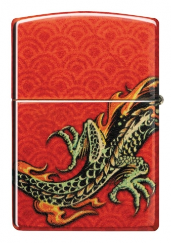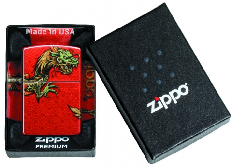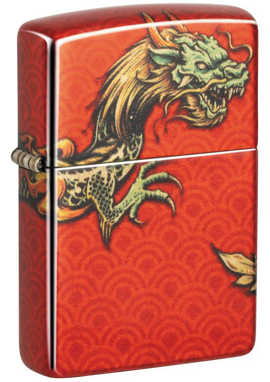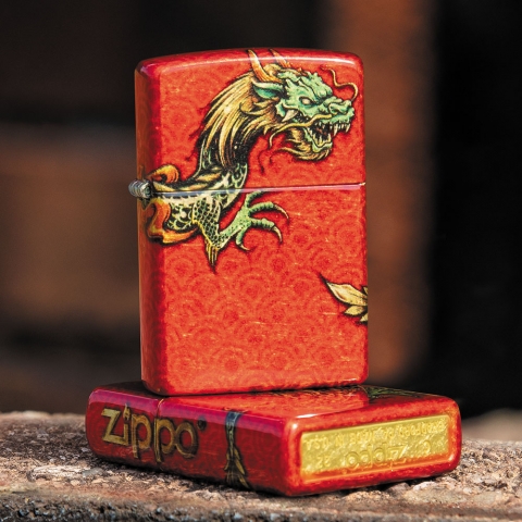 這條生動的龍設計在紅色幾何背景上盤旋,一側飾有 Zippo 標誌。