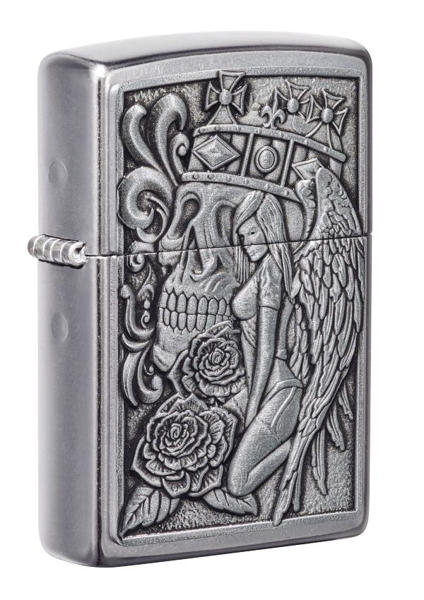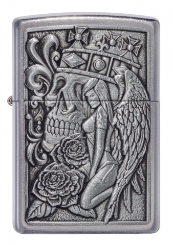 這個徽章上有精美的黑白插圖,上面有一個戴著王冠的骷髏和一位天使,