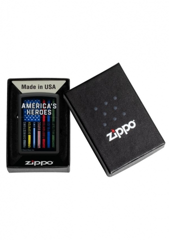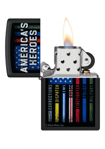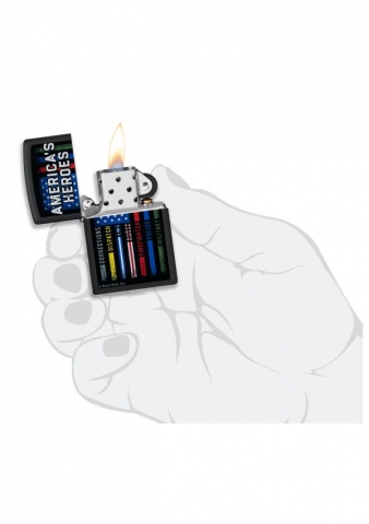 這款經典的黑色啞漆打火機以大膽的愛國主義彩色圖像設計,榮譽美國的英雄,以多條條紋國旗作為設計元素。