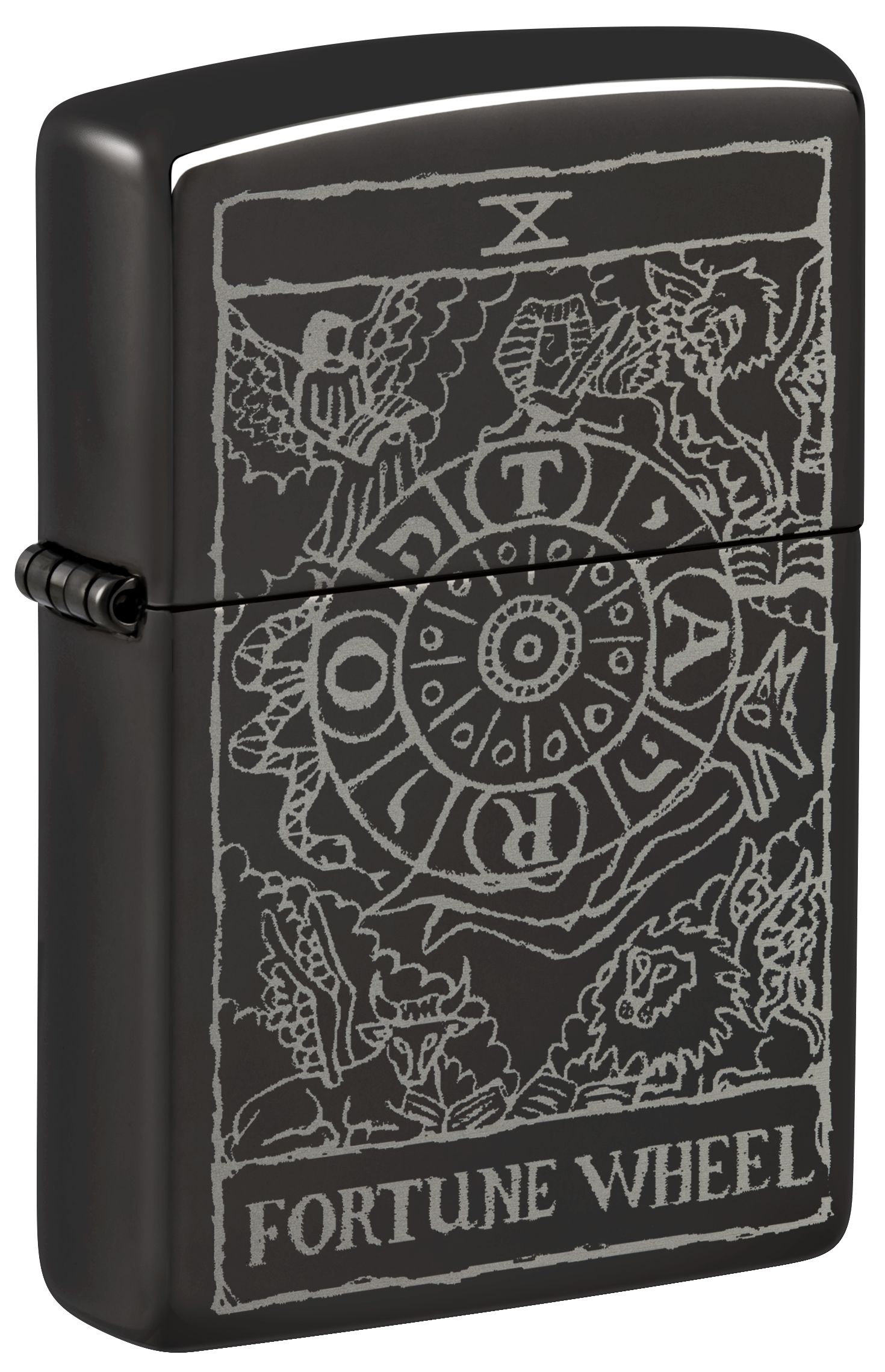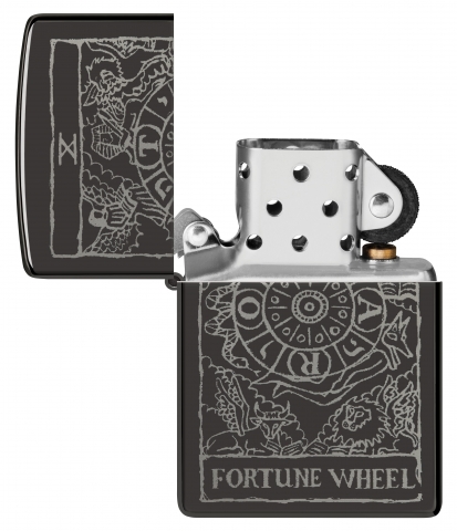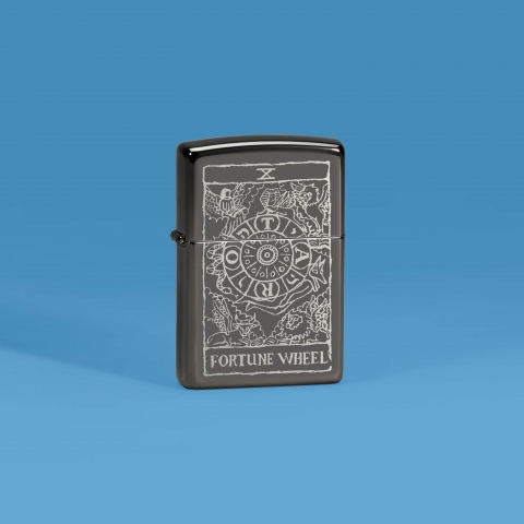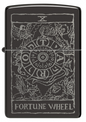 此款高拋光的黑色鏡面打火機,以塔羅牌中的命運之輪為靈感,