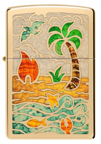 以充滿活力的色彩和閃閃發光的金屬色調捕捉寧靜的海灘場景。