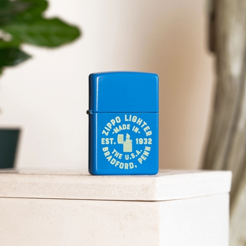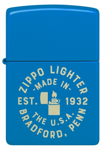 這款明亮、陽光明媚的天藍色啞漆打火機採用清晰的雷射雕刻設計,描繪了官方外觀的 Zippo 印章,