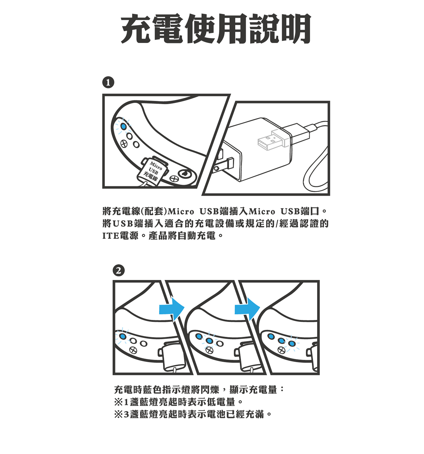 ﹡充電時,產品上有三個燈號顯示電量狀態。滿電時,三個燈全亮。