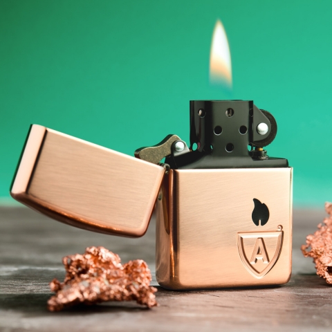 打火機的外殼使用實心銅製作,帶來了非凡的耐用性和經典的金屬光澤。