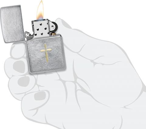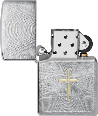 此款銀色機身打火機採用雷雕工藝,設計了帶有翅膀的金色十字,