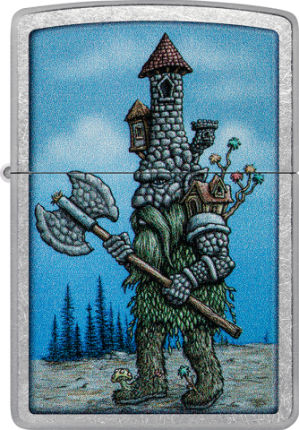 此款採用經典花紗機身。正面圖案使用色彩成像技術,呈現一座城堡坐落在一隻遊蕩的巨魔身上,安裝移動房屋配備內建安全系統。