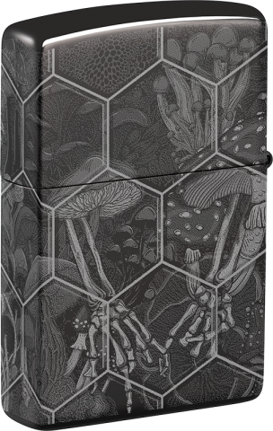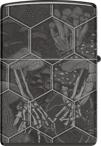 此款採用高拋光黑冰機身透過360度環繞雷射工藝,表面精緻地框繞著蜂窩圖案,腐朽的骷髏上生長出蘑菇,