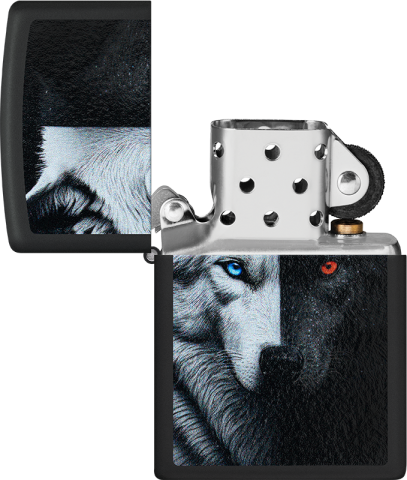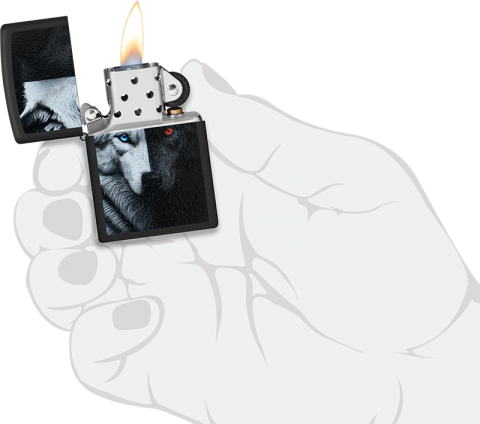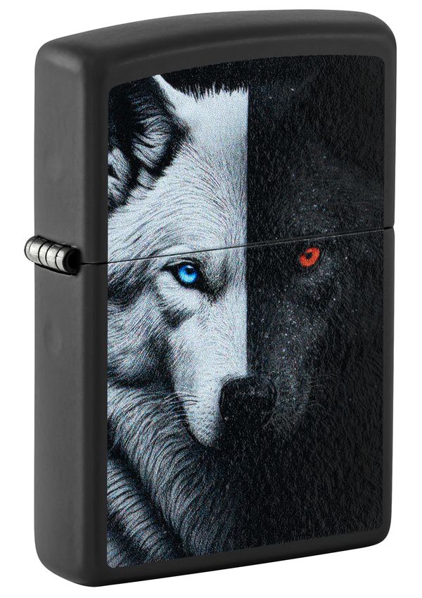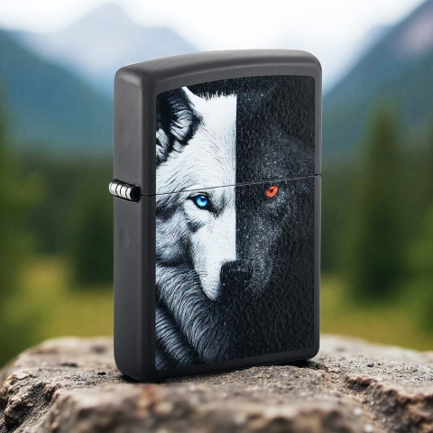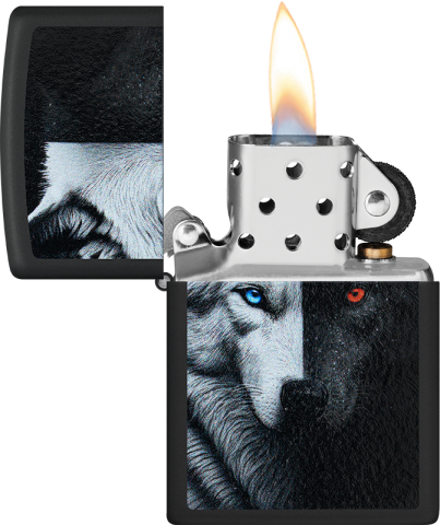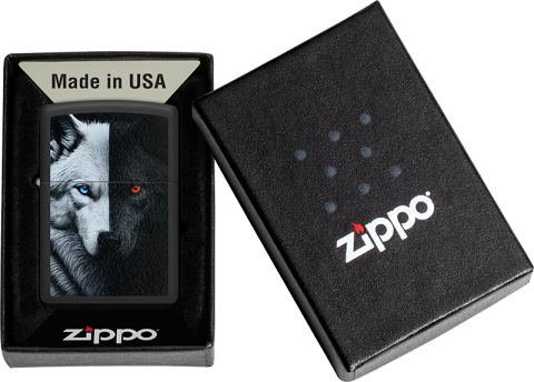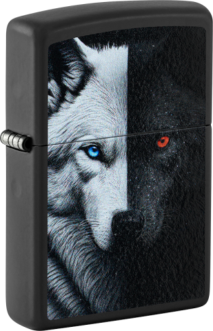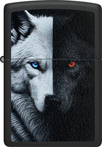 此款經典的黑色霧面防風打火機,以鮮明的彩色印刷設計,生動詮釋了源自美洲原住民的深刻寓言——「心中的兩隻狼」。
