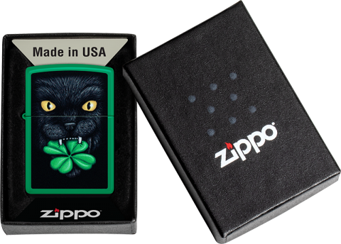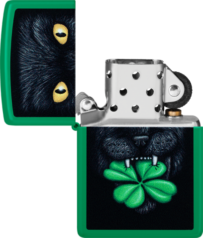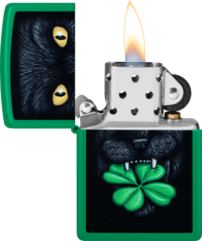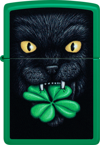 這款明亮的草綠色霧面打火機採用彩色圖像設計呈現主題,一隻神秘的黑貓嘴叼四葉幸運草,為你驅除壞運、帶來好運。