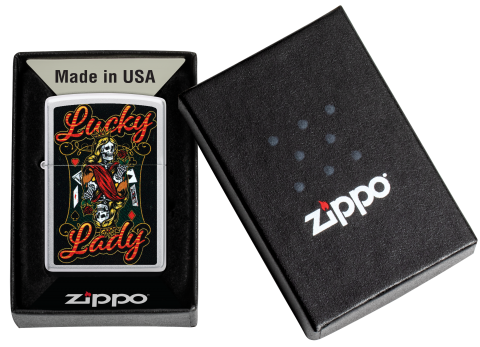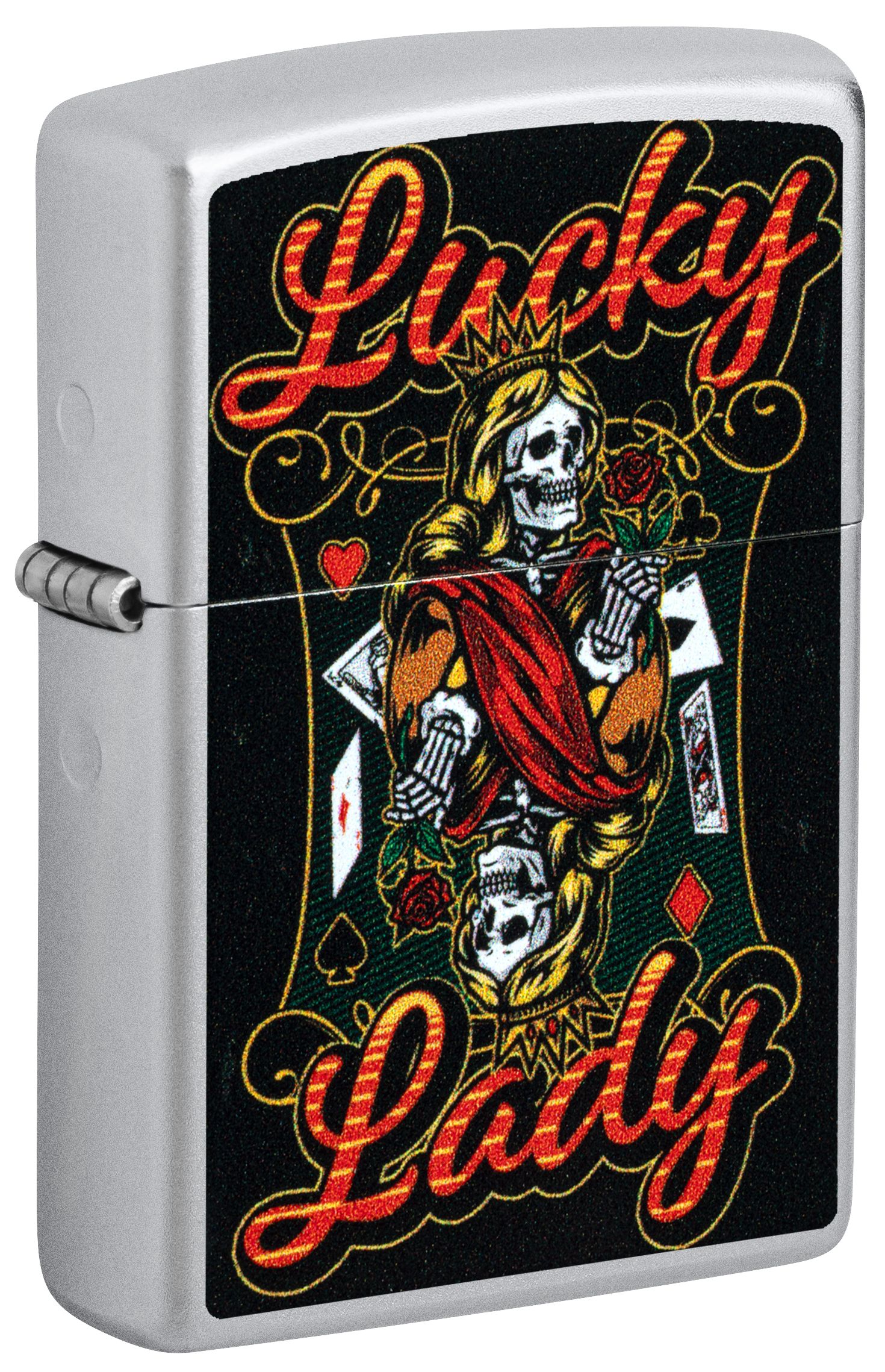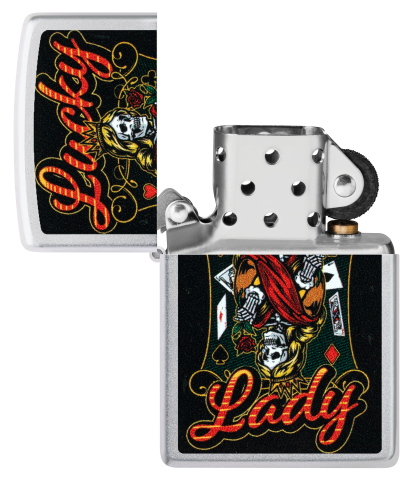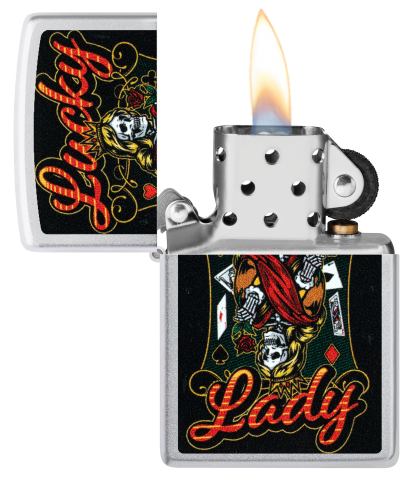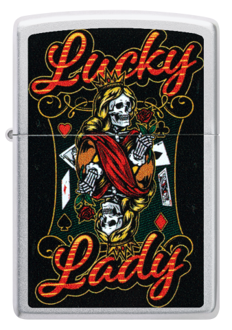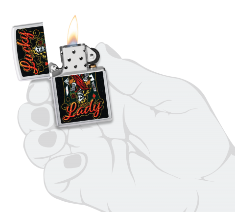此款經典緞面鉻防風打火機,一位手持玫瑰、眼神銳利的亡靈皇后形象,搭配燙金風格的「Lucky Lady」字樣,傳遞出命運、幸運與叛逆精神的結合。