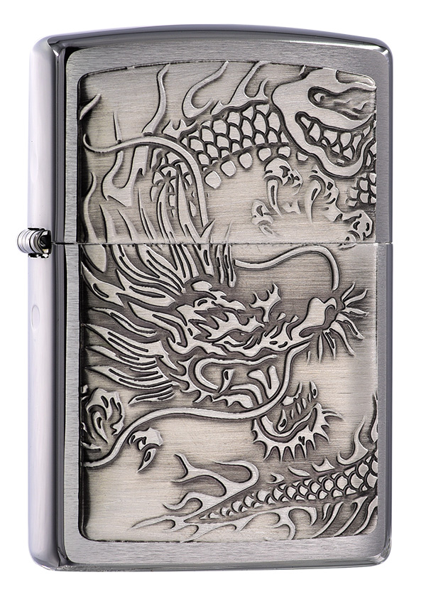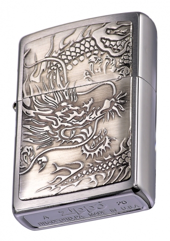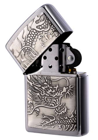 這款銀色髮絲紋機身打火機,以精美的龍紋設計為特色,