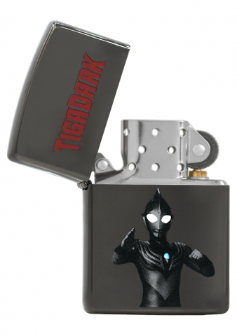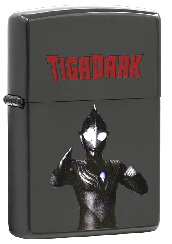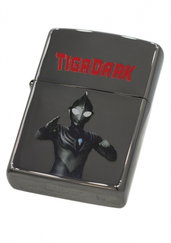 下方印有「Tiga Dark」的形象圖,深邃的黑色身軀與發亮的眼睛、胸口藍色能量核心形成強烈對比,充滿英雄氣勢與神秘感,讓人一眼難忘。